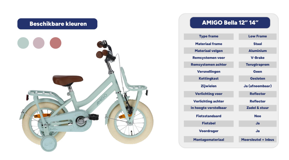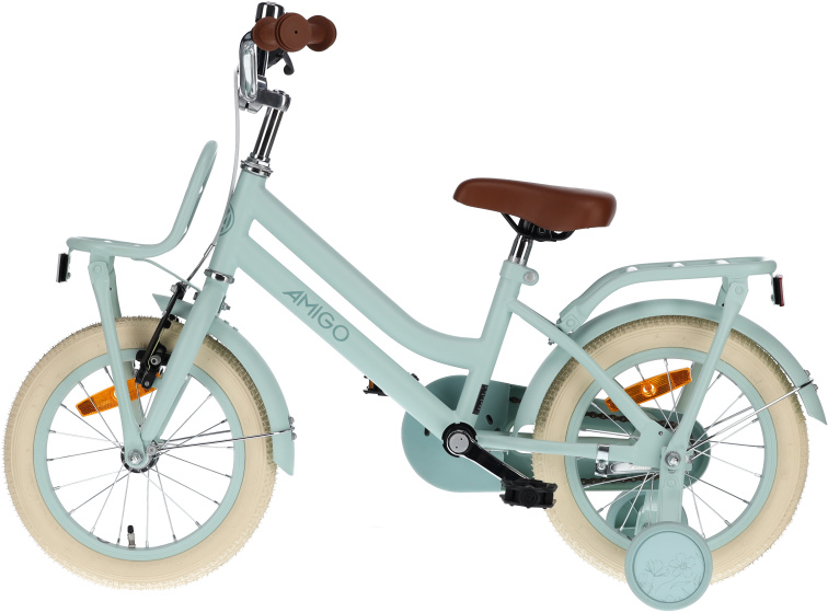 Du fährst mit einem Transportfahrrad herum wie deine große Schwester oder deine Mutter? Ab sofort kannst du das auch mit dem AMIGO Bella tun! Wie der Name schon sagt, ein schönes Fahrrad mit einem klassischen Transportdesign. Dieses 14-Zoll-Rad AMIGO Bella hat eine matte, pastellgrüne Farbe, die total modern ist. Die braunen Griffe und der Sattel verleihen ihm in Kombination mit den cremefarbenen Reifen und dem geblümten Kettenkasten ein schickes Finish. Sind Sie schon etwas fortgeschrittener mit dem Training? Dann probieren Sie doch mal eine Runde ohne die Seitenräder. Die Pluspunkte auf einen Blick: [+] Eine kräftige 3-teilige Kurbel, die im Vergleich zu einer ‘normalen’ 1-teiligen Kurbel leichter in die Pedale tritt [+] Ein maßgeschneiderter Frontgepäckträger, der mit einer Kiste oder einem Korb ausgestattet werden kann [+] Effektives Bremsen mit Rücktrittbremse und V-Brake [+] Attraktives Design und hohe Qualität durch eine dreifache Lackschicht mit Aufklebern darunter [-] Der Stahlrahmen ist schwerer als Aluminium, aber sehr stabil und preiswerter! [-] Kein Ständer beim Abnehmen der Seitenräder (separat erhältlich) Hohe Qualität Das AMIGO Bella hat eine 3-teilige Kurbel. Das bedeutet, dass das System zum Treten (die Kurbel) aus 3 Teilen besteht, anstatt aus 1. Das macht das System robuster und auch das Treten flüssiger. Super einfach für jemanden, der gerade erst mit dem Radfahren anfängt! Darüber hinaus sind alle Schrauben und Muttern aus rostfreiem Stahl und die Felgen aus stabilem Aluminium gefertigt. Schließlich wird die Farbe in 3 Schichten aufgetragen und die Aufkleber befinden sich unter der Lackschicht. Dadurch halten die Aufkleber jahrelang und das Fahrrad ist u.a. besser gegen Rost geschützt. Auf einer AMIGO Bella muss man lernen! Dank der V-Bremse in Kombination mit der Rücktrittbremse kann man sich daran gewöhnen, mit den Händen zu bremsen, und man kann immer auf die klassische Rücktrittbremse zurückgreifen. Super einfach, Radfahren zu lernen! Außerdem ist das Fahrrad serienmäßig mit Seitenrädern ausgestattet, die Sie abnehmen können, sobald Sie das Radfahren beherrschen. Die 3-teilige Kurbel sorgt außerdem für einen reibungslosen Tritt in die Pedale, was das Erlernen des Radfahrens noch ein bisschen einfacher macht! Ein funktionelles Design Stil und Funktionalität gehen Hand in Hand mit einem geschlossenen Kettenkasten, der mit einem hübschen Blumenmuster versehen ist. So wird die Kette vor Verschmutzung geschützt und funktioniert einwandfrei. Außerdem verhindert es, dass sich die Kleidung beim Radfahren verheddert. Der vordere Gepäckträger ist komplett maßstabsgetreu, so dass er genau zum Fahrrad passt. Kombiniert mit einem Fahrradkorb oder einer Kiste ist er eine Augenweide! AMIGO, bereit zur Bewegung AMIGO bringt Sie in Bewegung! Mit Produkten, die Spaß machen und ein frisches Design haben, und das zu einem überraschend niedrigen Preis. Die Kollektion AMIGO besteht aus (Elektro-)Fahrrädern, Fahrradteilen und -zubehör, Scootern, Skates, Balance-Bikes und Trampolinen. Da wir die Produkte von AMIGO selbst entwickeln und direkt von der Fabrik beziehen, können wir nicht nur eine gute Qualität, sondern auch einen guten Preis garantieren! So macht AMIGO auch Ihre Freizeit noch ein bisschen mehr Spaß. AMIGO, bereit zur Bewegung! Allgemeine Spezifikationen: Farbe: grün Geschlecht: Mädchen Material Rahmen: Stahl Material Felgen: Aluminium Material Kotflügel: Stahl Bereifung: Luftreifen (cremefarben) Altersangabe: 3 bis 5 Jahre Gewicht: ca. 11 kg Spezifikationen Größen: Radgröße: 14 Zoll Rahmengröße: 24 cm Geeignet für Körpergröße: 98-108 cm Verstellbare Sattelhöhe: ja Höhenverstellbarer Lenker: ja Bremsspezifikationen: Vorderradbremse: V-Bremse Bremstyp hinten: Rücktrittbremse Beleuchtungs-Spezifikationen: Vordere Beleuchtung: Reflektor Beleuchtung hinten: Reflektor Spezifikationen Zubehör: Montagematerial: inkl. Schraubenschlüssel und Inbusschlüssel Schutzbleche: ja, über Vorder- und Hinterrad Seitenräder: ja, abnehmbar Kettenschutz: geschlossen Gepäckträger: ja Gepäckträger vorne: ja Glocke: ja