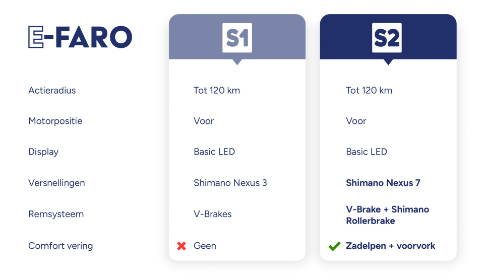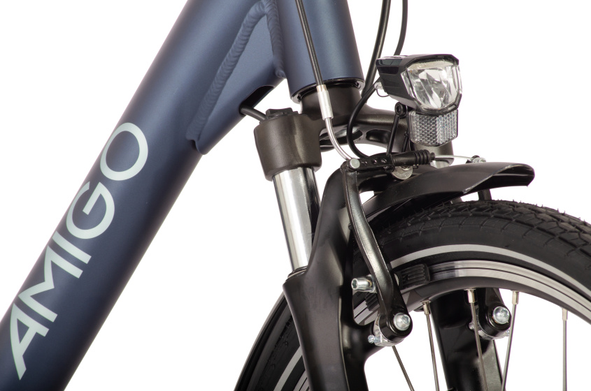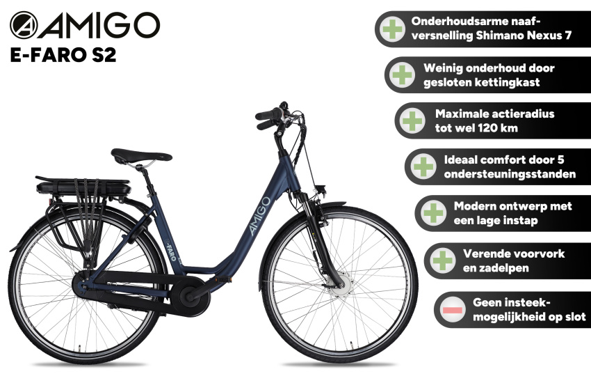 AMIGO E-Faro S2 Entdecken Sie das zeitlose E-Bike: das vielseitige, praktische Stadtrad. Mit seinem niedrigen Einstiegsniveau ist dieses Elektrofahrrad ideal für alle Altersgruppen und Bedingungen. Sein benutzerfreundlicher Charakter spiegelt sich auch in einem leichten Aluminiumrahmen wider, während die Federgabel und die Sattelstütze hohen Komfort bieten. Und dank der Shimano Nexus-Nabenschaltung ist die Wartung ein Kinderspiel. Das 28-Zoll-Frauenrad (mit einer Rahmengröße von 49 Zentimetern) erstrahlt in schönem Mattblau, kombiniert mit “Full Black”-Beschlägen und schwarzem Zubehör. Ein alter Vertrauter Kommt Ihnen das E-Faro bekannt vor? AMIGO Das könnte stimmen, denn es handelt sich um unser aktualisiertes elektrisches Citybike aus der Kollektion. Früher besser bekannt unter dem Namen E-City. Diesmal mit deutlichen Qualitätsverbesserungen, wobei die größten Fortschritte mit dem leistungsstarken Ananda M129-Motor gemacht wurden. Aber auch die klappbaren Pedale sind eine Bereicherung; das spart Montageaufwand, man muss sie nur ausklappen. AMIGO E-Faro S2 AMIGO E-Faro S2Sie fragen sich, was sich sonst noch hinter dem ? Dieses Modell ist das luxuriöseste Fahrrad der S-Line. Zum Beispiel unterscheidet sich dieses Modell in der Ausstattung deutlich vom S1. Dieses Citybike hat mehr Gänge. Sowohl eine Federgabel als auch eine Sattelstütze. Und anstelle einer V-Brake vorne und hinten wurde eine wartungsfreundliche Rollerbrake gewählt. Die wichtigsten Punkte werden im Folgenden hervorgehoben. Die Pluspunkte auf einen Blick: [+] Leistungsstarker 468Wh-Akku im Gepäckträger integriert [+] Reichweite min/max: 45 – 120 km (±65 km Durchschnittsverbrauch) [+] Hoher Komfort durch niedrigen Einstieg, Federgabel und Sattelstütze [+] Shimano Rollerbrake hinten mit ausreichender Bremswirkung [+] Wartungsarme Nabenschaltung Shimano Nexus 7 [+] Übersichtliche LED-Anzeige für optimale Bedienung (5 Stufen) [+] Aluminiumrahmen ist leichter als Stahl und resistenter gegen Rost [+] Verbessert mit z.B. leistungsstarkem Ananda M129 Motor und klappbaren Pedalen [-] Keine Schlossoption, exklusives Schloss separat erhältlich Sorglos auf der Straße Mit dem 468-Wh-Akku kommen Sie unbeschwert auf die Straße, legen weite Strecken zurück und sind bereit für eine lange Fahrradtour! Mit einer Reichweite von 45 bis 120 Kilometern unter optimalen Bedingungen, ±65 Kilometer bei durchschnittlichem Verbrauch. Verschiedene Faktoren wie Gewicht, Wetter, Straßenbelag usw. können die Länge oder Dauer Ihrer Fahrradtour beeinflussen. Der Akku ist gut in den Gepäckträger integriert und leicht abnehmbar, so dass das Aufladen unterwegs kein Problem ist. Möchten Sie auf der Terrasse in Ruhe Platz nehmen? Mit dem Axa Solid Ringschloss (geeignet für ART**-Versicherung) und dem verstellbaren Ständer ist das Fahrrad sicher und stabil. Die beste Begleitung während Ihrer Fahrradtour AMIGO E-Faro S2 A hilft Ihnen jederzeit und überall mit einer Unterstützung von bis zu 25 km/h auf Ihrem Weg. Der Vorderradmotor des Ananda M129 zieht dich vorwärts, so dass du einfach losradeln kannst. Ein Rotationssensor signalisiert dem Motor, registriert die Drehung des Tretlagers und bietet je nach Drehgeschwindigkeit die richtige Unterstützung. Selbst wenn Sie nicht viel Kraft aufwenden, erhalten Sie eine komfortable Unterstützung. Nehmen Sie die Shimano Nexus 7 Nabenschaltung, die fünf Unterstützungsstufen und die übersichtliche Ananda D15 LED-Anzeige. Für eine optimale Kontrolle gibt es eine Batterieanzeige und einen sofortigen Einblick in die Unterstützungsstufe, in der Sie gerade fahren! Wartungsfreundlich für alle! Ausgestattet mit einem geschlossenen Kettenkasten, Nabenschaltung und Rollerbrake ist dieses Elektrofahrrad wartungsarm. Diese geschlossenen Systeme sorgen dafür, dass die drehenden Teile gut vor äußeren Einflüssen geschützt sind. AMIGO Mit herausragenden Eigenschaften wie einem leichten Aluminiumrahmen, einem niedrigen Einstieg, einem verstellbaren Vorbau und einer gefederten Gabel und Sattelstütze ist dieses Fahrrad einzigartig im Komfort! Perfekt für Jung und Alt, auch für Menschen mit eingeschränkter Mobilität. E-Faro S2 Viel Spaß bei einem Ausflug auf dem ! AMIGO, bereit zur Bewegung! AMIGO bringt Sie in Bewegung! Mit Produkten, die Spaß machen und ein frisches Design haben, und das zu einem überraschend niedrigen Preis. AMIGO Die Kollektion besteht aus (Elektro-)Fahrrädern, Fahrradteilen und -zubehör, Scootern, Skates, Balance-Bikes und Trampolinen. AMIGO Da wir die Produkte selbst entwickeln und direkt von der Fabrik kaufen, können wir nicht nur gute Qualität, sondern auch einen guten Preis garantieren! AMIGO So macht auch Ihre Freizeit gleich noch ein bisschen mehr Spaß. AMIGO, bereit zur Bewegung! Spezifikationen allgemein: Rahmenfarbe: Mattblau Farbmodell: Blau Matt Geschlecht: Damen Material des Rahmens: Aluminium Material Felge: Aluminium (doppelwandig) Bereifung: Kenda mit Reflexion, 42-622 (schwarz) Sattel: Selle Royal Alpine (schwarz) Griffe: Herrmans Moza 91 (schwarz) Pedale: Faltpedale Radgröße: 28 Zoll Rahmengröße: 49 cm Lenker-Vorbau: verstellbar Gefederte Sattelstütze: ja (integriert) Federgabel: ja Gewicht: ca. 28 kg Spezifikationen der Schaltung: Gänge: 7 (Shimano Nexus) Schaltungsart: Nabenschaltung Antrieb: Kette Technische Daten Motor: Antriebsposition: Vorderrad Motortyp: Ananda M129, Vorderradmotor Pedalunterstützungssensor Typ: Rotationssensor Batterie-Spezifikationen: Batterieposition: integriert im Gepäckträger Batteriekapazität: 468Wh (36V, 13Ah) Batterietyp: Greenway YJ-145 Batterietechnologie: Lithium-Ionen Akku-Ladezeit: 5,5 – 7,5 Stunden Herausnehmbare Batterie: ja Reichweite: ± 65 KM (Durchschnittsverbrauch) MIN/MAX-Bereich: 45 – 120 KM Max. Geschwindigkeit: 25 KM p/h Spezifikationen der Anzeige: Anzeigetyp: LED Anzeigemodell: Ananda D15 Anzeigeposition: links Abnehmbares Display: nein Bedienung: siehe Handbuch (unter Dow
