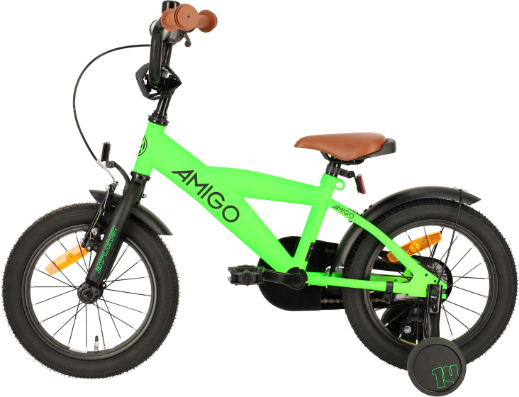 Mit dem Explorer von AMIGO kommst du auf die Straße! Auf diesem 14-Zoll-Jungenfahrrad mit seinem sportlichen Rahmen und der auffälligen Farbkombination, die sich sogar in den Reifen widerspiegelt, sieht dich jeder schon von weitem kommen. Psstt… noch nicht viel Fahrrad-Erfahrung? Die abnehmbaren Seitenräder sorgen für die richtige Ausgleich. Auch der Griff unter dem Sattel des Kinderfahrrads macht es der Begleitperson leicht, das Rad in die richtige Richtung zu schubsen. Erkunden Sie gemeinsam unser grünes und schwarzes Explorer! Die Pluspunkte auf einen Blick: [+] 3-teilige Kurbel” für sanftestes Fahrgefühl [+] Effektive Bremsleistung mit Rücktrittbremse und V-Brake [+] Langlebige Neuwertigkeit durch drei Doppellackierungen [+] Raffinierte Fertigung: Aufkleber unter der Lackierung angebracht [-] Der Stahlrahmen ist schwerer als Aluminium, aber stark und preisgünstig! [-] Kein Ständer beim Abnehmen der Seitenräder (separat erhältlich) Ungehindert und sicher durch den Verkehr Dank der 3-teiligen Kurbel fühlen sich die ersten Tretbewegungen so sanft an, wie man es bei keinem anderen Kinderfahrrad erleben kann. Eine solche 3-teilige Kurbel besteht aus separaten Teilen und macht die Bewegungen stromlinienförmiger als bei einer einteiligen, aus einem Stück geschmiedeten Kurbel. Dadurch hat die 3-teilige Kurbel auch eine viel längere Lebensdauer. Das gesamte Pedalsystem ist hinter einem geschlossenen Kettenkasten versteckt. Das verleiht dem Rad einen wartungsarmen und sicheren Charakter. Ein überzeugendes Bremssystem Auf unserem Explorer sind Sie natürlich superschnell unterwegs, was natürlich auch ein effektives und sicheres Bremsen erfordert. Mit der Rücktrittbremse bleiben Sie sofort stehen. Wollen Sie gezielter bremsen oder die Geschwindigkeit etwas reduzieren? Dann benutzen Sie die V-Brake an der Aluminium-Vorderradfelge, die viel stärker ist als eine normale Kneifbremse. Neben einer geschmierten Fahrt möchten Sie sich auf Ihrem Fahrrad auch sicher fühlen. Mit Hilfe der Reflektoren an Vorder- und Rückseite, an den Speichen und sogar an den Pedalen werden Sie gut sichtbar sein! ROBUST, auch auf lange Sicht! Der starke Stahlrahmen und die Stahlschutzbleche sind mit nicht weniger als drei Lackschichten erstellt, damit das Fahrrad auch beim Umfallen und Aufstehen schön bleibt. Auch die Aufkleber werden unter dem Lack verarbeitet, so dass das Design Jahr für Jahr unverändert bleibt – das sieht gut aus! Darüber hinaus sind sowohl der Lenker als auch der Sattel höhenverstellbar. Eine langlebige Idee, denn man kann mit diesem 14-Zoll-Jungenfahrrad (mit einer Rahmengröße von 21,5 Zentimeter) lange Zeit fahren bleiben. Geeignet für Kinder zwischen drei und fünf Jahren. AMIGO, bereit zur Bewegung AMIGO bringt dich in Bewegung! Mit Produkten, die Spaß machen und ein frisches Design haben, zu einem überraschend niedrigen Preis. Die AMIGO-Kollektion besteht aus (Elektro-)Fahrräder, Fahrradteilen und -zubehör, Scooter, Rollschuhen, Balancierräder und Trampolinen. Da wir die Produkte von AMIGO selbst entwickeln und direkt von der Fabrik beziehen, können wir nicht nur eine gute Qualität, sondern auch einen guten Preis garantieren! So macht AMIGO auch Ihre Freizeit noch ein bisschen mehr Spaß. AMIGO, bereit zur Bewegung! Allgemeine Spezifikationen: Farbe: grün, schwarz, braun Geschlecht: Jungen Material Rahmen: Stahl Material Felgen: Aluminium Material Schutzbleche: Stahl Bereifung: Luftreifen (schwarz) Altersangabe: 3 bis 5 Jahre Gewicht: ca. 9,8 kg Spezifikationen Größen: Radgröße: 14 Zoll Rahmengröße: 21,5 cm Geeignet für Körpergröße: 98-108 cm Sattelhöhe: 46 cm (in der niedrigsten Position, vom Boden aus gemessen) Verstellbare Sattelhöhe: ja Verstellbare Lenkerhöhe: ja Spezifikationen Bremsen: Vorderradbremse: V-Bremse Hinterradbremse: Rücktrittbremse Spezifikationen Beleuchtung: Frontbeleuchtung: Reflektor Ruckbeleuchtung: Reflektor Spezifikationen Zubehör: Montagematerial: inkl. Schraubenschlüssel und Inbusschlüssel Schutzbleche: ja, über Vorder- und Hinterrad Seitenräder: ja, abnehmbar Kettenschutz: geschlossen Klingel: ja