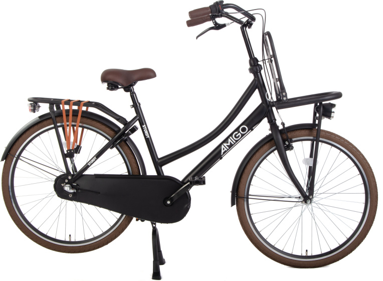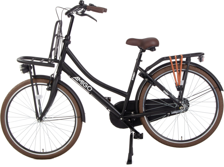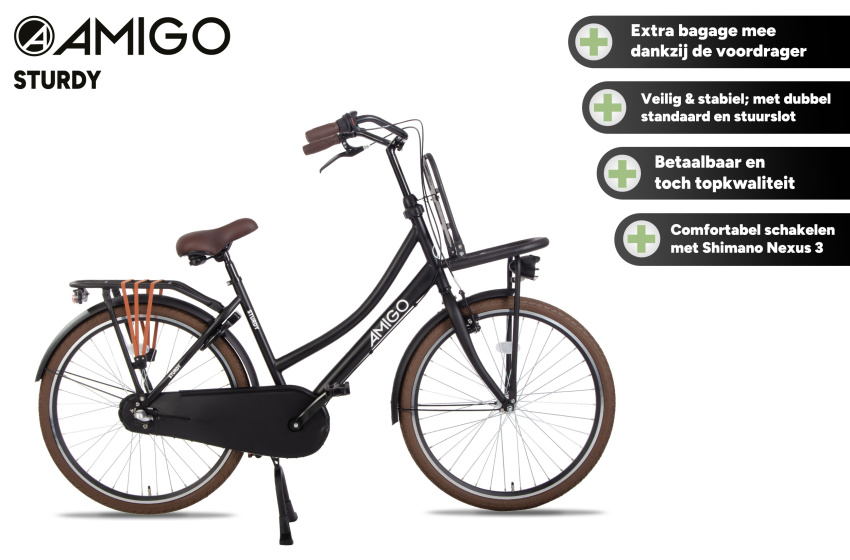 AMIGO Sturdy Das ist ein Transportfahrrad, das Sie und Ihre Sachen stilvoll ans richtige Ziel bringt! Auf dem vorderen Gepäckträger und dem Gepäckträger ist genug Platz für Ihre Büchertasche, Laptoptasche oder Sporttasche. Außerdem hat dieses mattschwarze Transportrad dank der braunen Details einen schönen Farbkontrast. Das 26-Zoll-Kinderfahrrad (mit einer Rahmengröße von 46 Zentimetern) ist somit ideal für jede Gelegenheit. Zusammen mit der Schaltung (Shimano Nexus 3) radeln Sie problemlos durch die Woche. Die Pluspunkte auf einen Blick: [+] Wartungsarme Nabenschaltung Shimano Nexus 3 [+] Effektives Bremssystem mit Rücktrittbremse und V-Brake [+] Starker, robuster Stahlrahmen und ein stabiler Frontgepäckträger [+] Sicher & stabil; mit Doppelständer und Lenkerarretierung! Ein robustes Fundament AMIGO Sturdy Der robuste Stahlrahmen des bringt Sie problemlos von einem Ort zum anderen. Das Transportrad ist zum Beispiel mit einer Shimano Nexus 3-Schaltung ausgestattet; mit dieser Schaltung ist kein Widerstand zu groß. Außerdem darf natürlich ein gutes Bremssystem nicht fehlen. Eine einfache, aber sehr wirkungsvolle Art zu bremsen, ist daher sicherlich die Rücktrittbremse am Hinterrad. Diese wird mit der V-Brake am Vorderrad kombiniert. Für zusätzliche Sicherheit ist das Transportrad mit einem Vorderlicht, einem Rücklicht und Reflektoren an den Speichen und den Pedalen ausgestattet. Unendlich viel Platz für Gepäck Sturdy Das Transportfahrrad ist mit genügend Möglichkeiten ausgestattet, um Ihr Hab und Gut auf einfache Weise zu transportieren. Auf dem Frontgepäckträger und dem Gepäckträger ist viel Platz vorhanden. Kombinieren Sie den Frontgepäckträger mit einer stabilen Fahrradkiste oder einem attraktiven Weidenkorb. Nutzen Sie den Gepäckträger dank der Schnellverschlussriemen optimal aus. Wenn Sie an Ihrem Zielort angekommen sind, schließen Sie das Fahrrad mit dem Ringschloss ab. Dank des Doppelständers und des Lenkerschlosses ist das Abstellen nicht nur sicher, sondern auch stabil! Immer bereit zum Losfahren! AMIGO Sturdy Auf dem robust konstruierten Fahrrad werden Sie sich rundum wohlfühlen. Vom intensiven Sporttraining über die anstrengende Schulwoche bis hin zur Entspannung zu Hause. Robust und leistungsstark, das perfekte Mädchenfahrrad, das dich in jeder Situation weiterbringt. Entdecken Sie die Vielseitigkeit dieses praktischen Transportrades. AMIGO, bereit für die Bewegung AMIGO bringt dich in Bewegung! Mit Produkten, die Spaß machen und ein frisches Design haben, und das zu einem überraschend niedrigen Preis. AMIGO Die Kollektion besteht aus (Elektro-)Fahrrädern, Fahrradteilen und -zubehör, Scootern, Skates, Balance-Bikes und Trampolinen. AMIGO Da wir die Produkte selbst entwickeln und direkt von der Fabrik kaufen, können wir nicht nur gute Qualität, sondern auch einen guten Preis garantieren! AMIGO So macht auch Ihre Freizeit gleich noch ein bisschen mehr Spaß. AMIGO, bereit zur Bewegung! Allgemeine Spezifikationen: Farbe: Mattschwarz Farbdetails: Braun Farbmodell: Schwarz, Braun Geschlecht: Damen Material Rahmen: Stahl Material Felge: Aluminium Bereifung: Innova, 47-559 (braun) Radgröße: 26 Zoll Rahmengröße: 46 cm Lenker-Vorbau: fest Gefederte Sattelstütze: nein Federgabel: nein Gewicht: ca. 21,1 kg Spezifikationen der Schaltung: Gänge: 3 (Shimano Nexus) Schaltungsart: Nabenschaltung Antrieb: Kette Bremsspezifikationen: Vordere Bremse: V-Bremse Bremstyp hinten: Rücktrittbremse Beleuchtungs-Spezifikationen: Vordere Lichter: batteriebetrieben Rückleuchten: batteriebetrieben Spezifikationen Zubehör: Fahrradständer: ja, Doppelbein Kettenschutz: geschlossen (Lacktuch) Gepäckträger: ja Gepäckgurte: ja Gepäckträger vorne: ja Lenkerschloss: ja Klingel: ja Schloss: Ringschloss