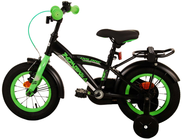 Thombike VolareStiehl die Show wie ein echter Rennfahrer auf dem von! Der schwarze Rahmen mit super-schnellen grünen Details macht jeder Angst für Ihre Leistung auf dem Fahrrad. Dieses 12-Zoll-Jungenfahrrad mit abnehmbaren Stützrädern ist die Lösung, um mit Zuversicht auf das Fahrrad zu springen! MEGA stark Fahrradfahren zu lernen und gleichzeitig das Gleichgewicht zu halten, kann ganz schön knifflig sein. Der starke Stahlrahmen dieses Kinderfahrrads ist dank der abnehmbaren Seitenräder besonders stabil. Die Griffe geben den richtigen Halt und der weiche Sattel ist super bequem, ein guter Start für die ersten Aktivitäten auf dem Fahrrad! Der geschlossene Kettenkasten verhindert gefährliche Situationen wie z.B. das Einklemmen von Kleidung oder eingeklemmten Fingern. Sicherheit geht vor So geht’s! Fahren Sie mühelos an allen vorbei, aber passen Sie auf! Werden Sie im Gegenverkehr langsamer? Die Feststellbremse am Vorderrad hilft dir, die Geschwindigkeit zu reduzieren, und die Rücktrittbremse stoppt dich in Sekundenschnelle. Wachstumsfahrrad! Besonders in jungen Jahren wachsen Kinder unglaublich schnell. Aber seien Sie versichert, dass sowohl der Sattel als auch der Lenker höhenverstellbar sind, so dass Sie das Fahrrad problemlos an alle Körperproportionen anpassen können. Dieses Kinderfahrrad mit einer Radgröße von 12 Zoll ist für Kinder zwischen zwei und vier Jahren geeignet. Superschnelles Design Thombike Volare Fahre mit dem Jungenfahrrad von gegen deine Klassenkameraden auf dem Schulhof oder deine Freunde aus der Nachbarschaft. Das Fahrrad ist mit vielen Funktionen wie einem Gepäckträger mit Schnellspanngurten, Reflektoren und einer Fahrradklingel ausgestattet. Aber es hat auch extralange Schutzbleche, die den ganzen Dreck aufhalten. So kannst du einfach durch die Pfützen fahren! Allgemeine Spezifikationen: Farbe: schwarz, grün Geschlecht: Jungen Material Rahmen: Stahl Material Felgen: Stahl Bereifung: Luftreifen (schwarz) Altersangabe: 2 bis 4 Jahre Maximale Belastbarkeit: 60 kg Gewicht: ca. 9 kg Spezifische Größen: Radgröße: 12 Zoll Rahmengröße: 21,5 cm Länge der Innennaht: 41-49 cm Körperlänge: 90-105 cm Verstellbare Sattelhöhe: ja, 37-45 cm Höhenverstellbarer Lenker: ja Bremsspezifikationen: Vorderradbremse: Pinch-Bremse Bremstyp hinten: Rücktrittbremse Beleuchtungs-Spezifikationen: Beleuchtung vorne: Reflektor Beleuchtung hinten: Reflektor Spezifikationen Zubehör: Schutzbleche: ja, über Vorder- und Hinterrad Seitenräder: ja, abnehmbar Kettenschutz: geschlossen Gepäckträger: ja Schnellbereifung: ja Glocke: ja