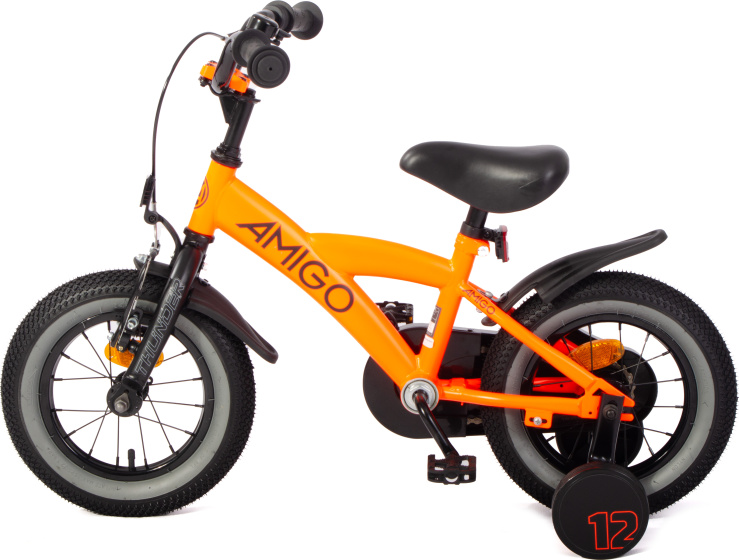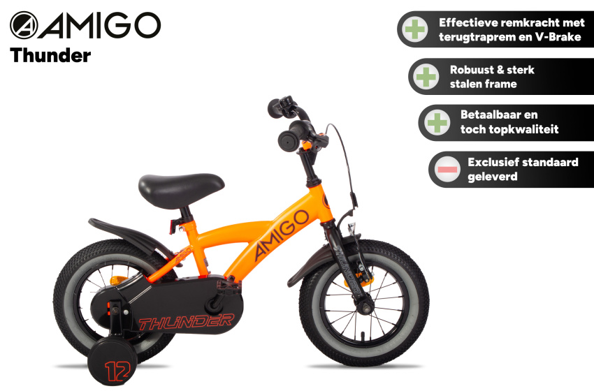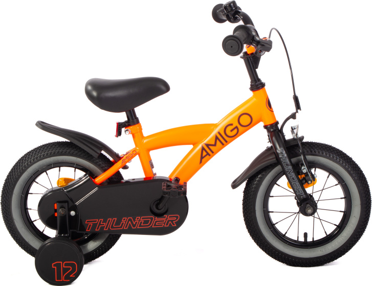 Unser AMIGO Thunder ist einfach donnernd! Auf diesem Kinderfahrrad mit sportlichem Stahlrahmen, ohne Schnickschnack und in auffälliger Neon-Farbkombination sieht dich jeder schon von weitem kommen. Das orange-schwarze 12-Zoll-Jungenrad ist mit “Full Black”-Beschlägen kombiniert. Schon etwas fortgeschrittener mit Übung? Dann versuchen Sie doch mal eine Runde ohne die abnehmbaren Seitenräder. Steig auf das formidable Thunder und rase vorbei! AMIGO Thunder Das AMIGO Thunder hat alle Grundvoraussetzungen, die man von einem guten Kinderfahrrad erwartet. Ein gutes Bremssystem, abnehmbare Seitenräder, ein geschlossener Kettenkasten, eine 1-teilige Kurbel und ein stabiler Rahmen, der mit einem regelmäßigen Anstrich und Aufklebern versehen ist. Vergleichen Sie dieses Modell mit dem AMIGO Roady, AMIGO Urban, AMIGO Bella, AMIGO 2Cool, AMIGO Speeder oder dem AMIGO Explorer. Dieses AMIGO Kinderfahrrad ist besonders günstig! Dank der cleveren Verpackung genießen Sie zusätzliche Vorteile. Das Vorderrad ist separat im Karton verpackt, wodurch die Verpackung kleiner und damit der Versand günstiger wird. Das Vorderrad müssen Sie bei Erhalt trotzdem montieren. Wollen Sie diese Mühe nicht haben? Dann wählen Sie Montage im Warenkorb. Auf diese Weise behalten Sie immer noch einen großen Teil Ihres Vorteils. Trotz dieser Kostenersparnis macht das Fahrrad keine Kompromisse bei Stil, Funktion und Qualität! Die Pluspunkte auf einen Blick: [+] Effektive Bremsleistung mit Rücktrittbremse und V-Brake [+] Solide Qualität und preisgünstig [-] Kein Ständer beim Abnehmen der Seitenräder (separat erhältlich) Ein robustes und überzeugendes Bremssystem Auf unserem Thunder sind Sie natürlich superschnell unterwegs, was natürlich ein effektives und sicheres Bremsen erfordert. Mit der Rücktrittbremse bleiben Sie sofort stehen. Sie wollen gezielter bremsen oder die Geschwindigkeit etwas reduzieren? Dann benutzen Sie die V-Brake an der Stahlfelge vorne, die viel stärker ist als eine normale Kneifbremse. Neben einer geschmierten Fahrt wollen Sie sich auf dem Rad auch sicher fühlen. Dank der Reflektoren vorne, hinten, an den Speichen und sogar an den Pedalen sind Sie gut sichtbar. So fallen Sie auf jeden Fall auf! Benutze die Fahrradklingel, damit alle hören, dass du vorbeifährst. VIELSEITIG, auch auf lange Sicht! Kinder wachsen sehr schnell, besonders in jungen Jahren. Aber seien Sie versichert, dass sowohl der Sattel als auch der Lenker höhenverstellbar sind, so dass Sie das Fahrrad leicht an jede Körpergröße anpassen können. Ein nachhaltiger Gedanke, denn auf diesem 12-Zoll-Jungenfahrrad (mit einer Rahmengröße von 21 Zentimetern) kann man lange Zeit fahren. Geeignet für Kinder zwischen zwei und vier Jahren. Mit dem AMIGO Thunder durch die Straßen düsen wie ein wahres Gewitter aus Abenteuer und Spaß! AMIGO, bereit zur Bewegung AMIGO bringt dich in Bewegung! Produkte mit einem lustigen und frischen Design zu einem überraschend niedrigen Preis. Die Kollektion AMIGO besteht aus (Elektro-)Fahrrädern, Fahrradteilen und -zubehör, Scootern, Skates, Balance-Bikes und Trampolinen. Da wir die Produkte von AMIGO selbst entwickeln und direkt von der Fabrik beziehen, können wir nicht nur eine gute Qualität, sondern auch einen guten Preis garantieren! So macht AMIGO auch Ihre Freizeit noch ein bisschen mehr Spaß. AMIGO, bereit zur Bewegung! Allgemeine Spezifikationen: Farbe: neon orange, schwarz Geschlecht: Jungen Material Rahmen: Stahl Material Felgen: Stahl Material Griffe: Gummi Material Kotflügel: Kunststoff Bereifung: Luftreifen (schwarz) Altersangabe: 2 bis 4 Jahre Gewicht: ca. 9,2 kg Spezifikationen Größen: Radgröße: 12 Zoll Rahmengröße: 21 cm Geeignet für Körpergröße: 90-105 cm Verstellbare Sattelhöhe: ja Höhenverstellbarer Lenker: ja Bremsspezifikationen: Vorderradbremse: V-Bremse Bremstyp hinten: Rücktrittbremse Beleuchtungs-Spezifikationen: Vordere Beleuchtung: Reflektor Beleuchtung hinten: Reflektor Spezifikationen Zubehör: Schutzbleche: ja, über Vorder- und Hinterrad Seitenräder: ja, abnehmbar Kettenschutz: geschlossen Klingel: ja